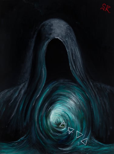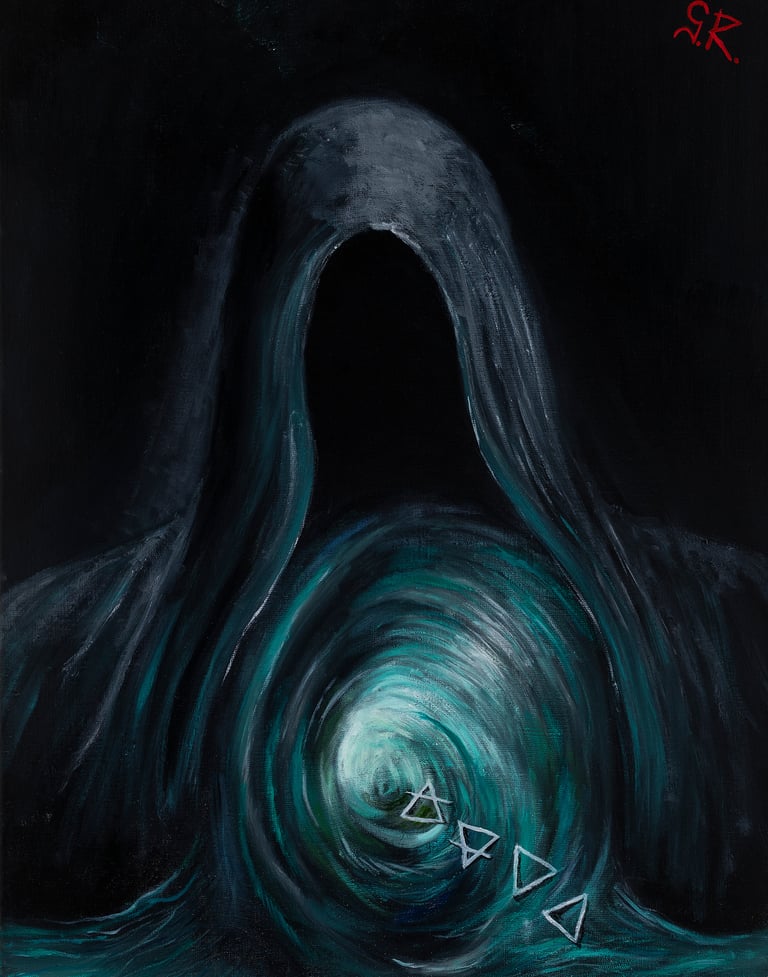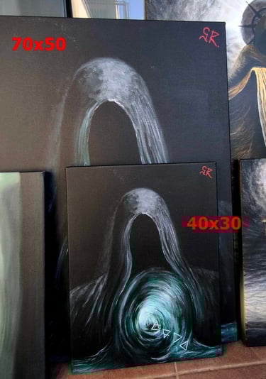 Naujausias G. Rameikaitės kūrinys - "Portalas" savo mistiškumu, meditatyviomis spalvomis ir kūrėjai būdingu filosofiniu neapibrėžtumu įtraukiantis į naujas, nepažintas protui erdves. Ties sūkuriu matomi keturi elementai, kurie simbolizuoja keturias stichijas (oras, vanduo, žemė, ugnis) tarytum veda į alcheminį virsmą - sielos išgryninimą ir atsivėrimą naujam, dar neatrastam idėjų srautui.